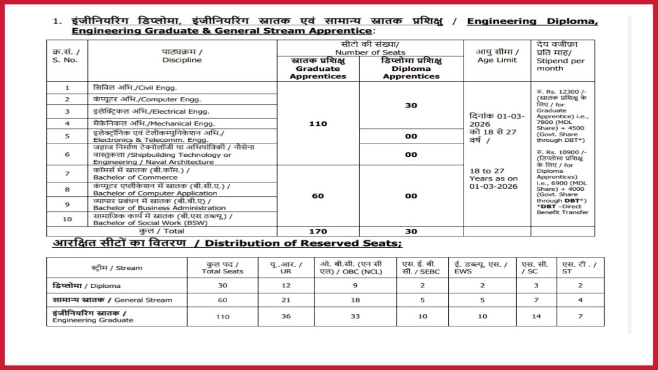 स्नातक / डिप्लोमा- विषय / ट्रेड प्रशिक्षु: सिविल, कंप्यूटर, इलेक्ट्रिकल, इलेक्ट्रॉनिक्स और दूरसंचार, मैकेनिकल, जहाज निर्माण प्रौद्योगिकी, बी.कॉम, बीसीए, बीबीए, बीएसडब्ल्यू