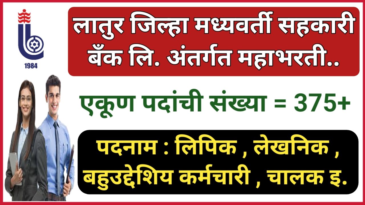 लातूर जिला केंद्रीय सहकारी बैंक लिमिटेड आंतरिक क्लर्क, लेखक, बहुउद्देश्यीय कार्यकर्ता, ड्राइवर आदि महाभारती, 375+ रिक्त पदों के लिए प्रक्रिया लागू की जा रही है, उक्त पदों के लिए आवश्यक योग्यता रखने वाले उम्मीदवारों से निर्धारित अवधि के भीतर ऑनलाइन मोड के माध्यम से आवेदन आमंत्रित किए जाते हैं। (लातूर डीसीसी बैंक में विभिन्न पदों के लिए भर्ती, पद रिक्तियों की संख्या – 375+) आइए रिक्तियों की संख्या इस प्रकार देखें।