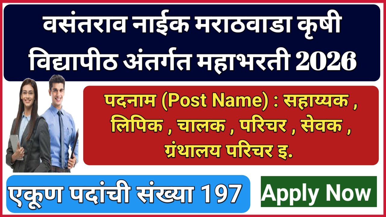 वसंतराव नाइक मराठवाड़ा कृषि विश्वविद्यालय के अंतर्गत सहायक, क्लर्क, ड्राइवर, परिचारक, नौकर, पुस्तकालय परिचारक आदि। महाभारती में 197 पदों हेतु प्रक्रिया क्रियान्वित की जा रही है तथा उक्त पदों हेतु आवश्यक योग्यता रखने वाले अभ्यर्थियों से निर्धारित अवधि में ऑनलाइन आवेदन पत्र आमंत्रित किये जा रहे हैं। (वीएनएमकेवी परभणी में विभिन्न पदों के लिए भर्ती, पद रिक्तियों की संख्या – 197) आइए रिक्ति का विस्तृत विवरण इस प्रकार देखें।